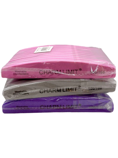 Lima esponja dual (100/180 grit) con forma medialuna. Pulido suave y eliminación de imperfecciones en bordes.